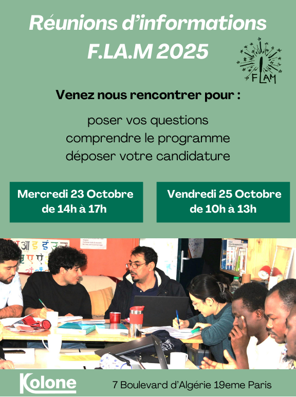 L’association KOLONE lance la troisième promotion du programme F.LA.M Français Langues et Médiation, un Parcours Linguistique à Visée Professionnelle pour la découverte des métiers d'interprète-médiateur interculturel, chargé d'accueil ou d'accompagnement social auprès de personnes exilées.