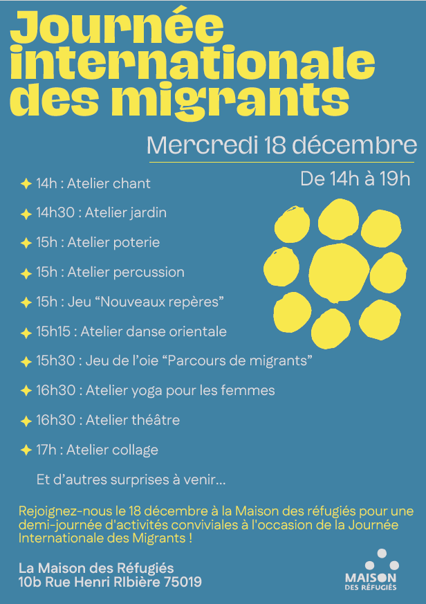 Mercredi 18 décembre, rejoignez-nous à la Maison des réfugiés pour partager une demi journée d’activités conviviales pour la Journée internationale des migrants !