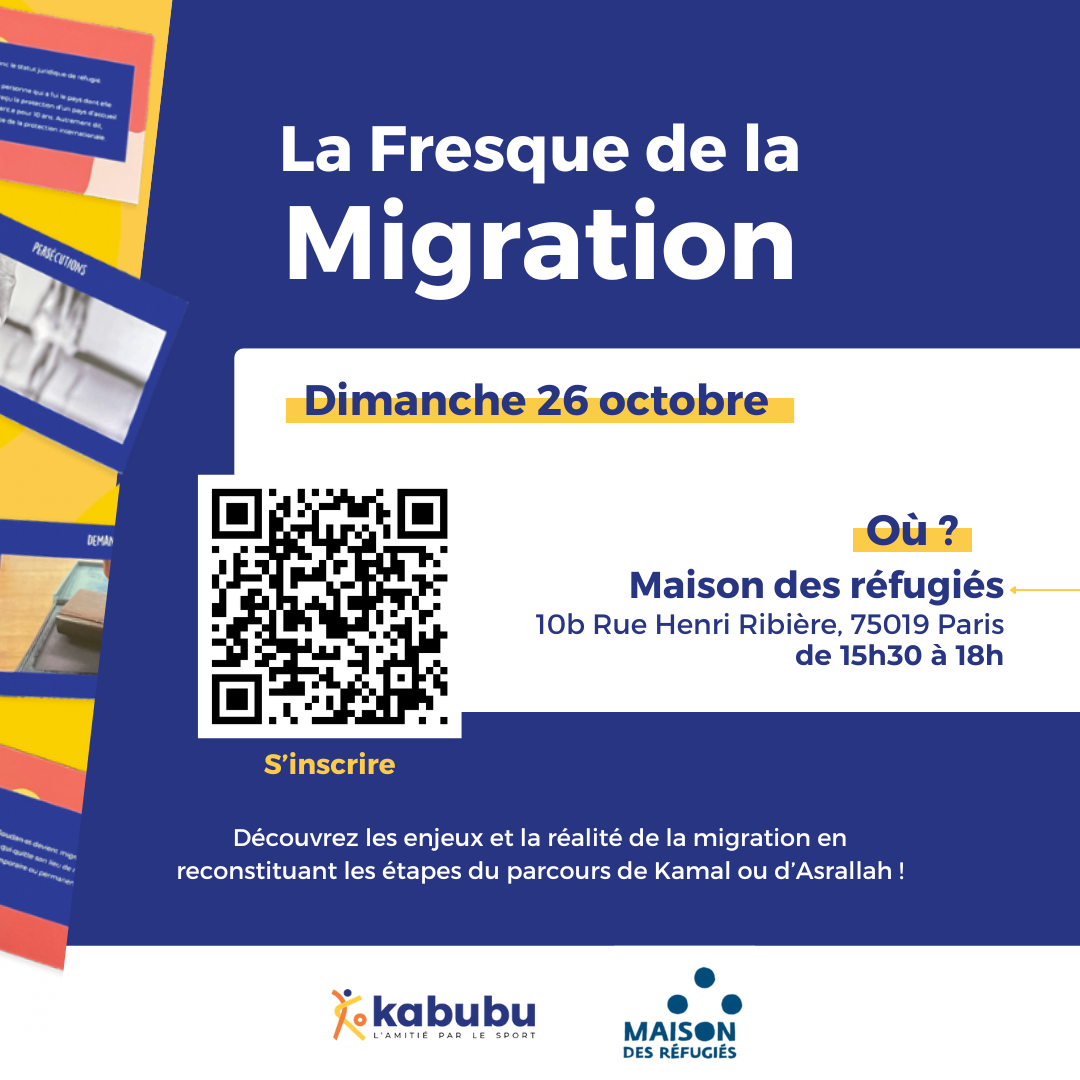 Kabubu t'invite à participer à la fresque de la migration, le dimanche 26 octobre de 15h30 à 18h. Ce jeu de plateau vous permet de découvrir les enjeux et la réalité de la migration.